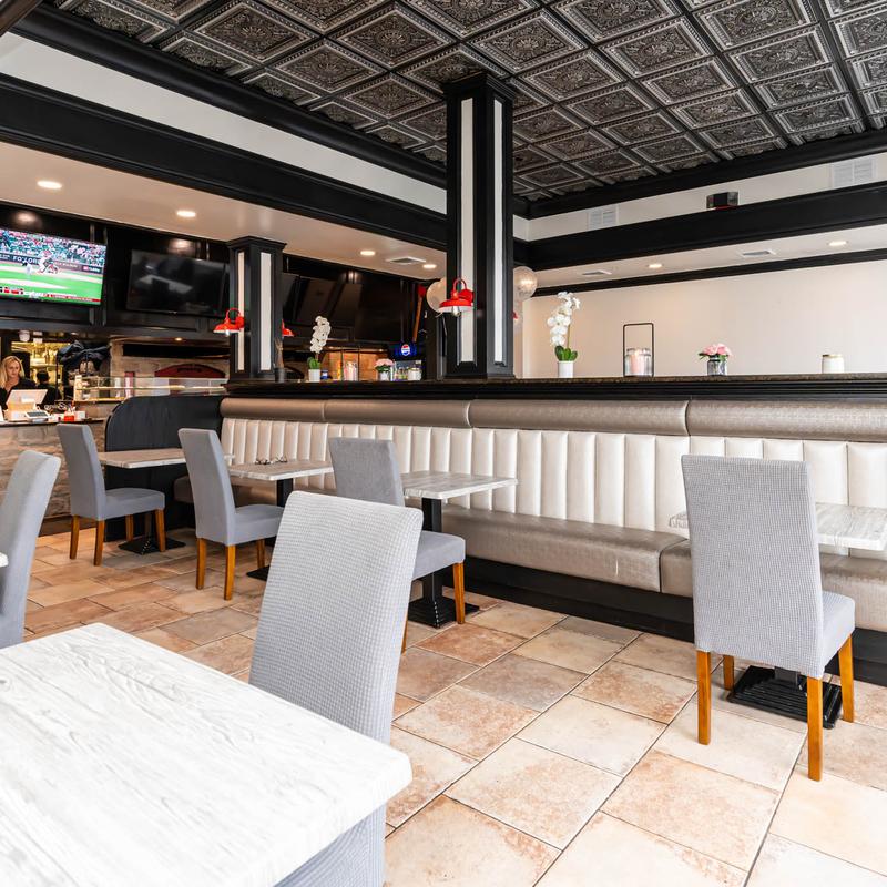 Done in take out. Both incredible service. The food is amazing. Mussels with white wine sauce was to die for. Calamari so tender. Definitely a DO NOT MISS OUT on this incredible new restaurant. Also picked up pizza for the family. Tasted like it literally just came out of the oven.